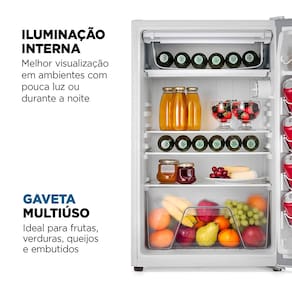 Para maior praticidade, o frigobar possui gaveta multiúso para frutas e legumes, iluminação interna para facilitar a visualização dos itens e 7 níveis de controle de temperatura para preservar o frescor dos alimentos.