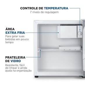 Com design compacto, o interior foi projetado para aproveitar cada centímetro de forma eficiente. A prateleira de vidro temperado, além de oferecer estabilidade e ser fácil de limpar, é ideal para organizar muito bem todos os itens. O compartimento interno da porta acomoda garrafas de até 2 litros, enquanto a área extra fria gela bebidas rapidamente, trazendo mais praticidade ao seu dia a dia.