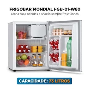 O Frigobar Mondial FGB-01-W80 oferece 73 litros de espaço interno, perfeito para armazenar bebidas, frutas e lanches em casa, no escritório, no quarto ou em áreas externas. Com design moderno, porta reversível e puxador embutido, ele se adapta facilmente a qualquer ambiente.