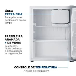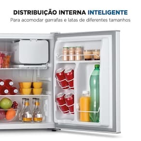 Distribuição interna inteligente Prateleira de vidro temperado, prateleira aramada e porta com espaço para 4 latas e garrafas de até 2 litros.