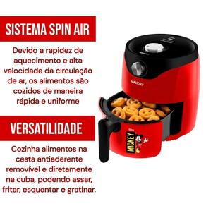 Características: - sistema spin air - alça fria - controle de temperatura que vai de 80ºc a 200ºc - alimentos podem ser preparados na cesta ou na cuba - assa, frita, esquenta e gratina - cesto antiaderente removível - timer de 30 minutos - produto exclusivo e licenciado disney