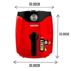 Especificações técnicas: - marca: mallory - linha: disney - modelo: funny fryer b97200341 - cor: preta e vermelha - tipo de material: plástico - voltagem: 110v/127v - potência: 1200 watts - classificação: a+ - consumo médio: 1,2kw/h - capacidade: 3 litros - dimensões do produto lxaxp: 26,5 x 32 x 26,5 cm - peso do produto: 3,9kg - dimensões do produto com a embalagem lxaxp: 30,9 x 35,9 x 30,9 cm - peso do produto com a embalagem: 4kg - comprimento do cabo: 60 cm - tipo de fonte de energia: energia elétrica - necessita uso de óleo: não - pés antiderrapantes: sim - programável: sim - temporizador: sim - desligamento automático: sim - garantia do fabricante: 12 meses