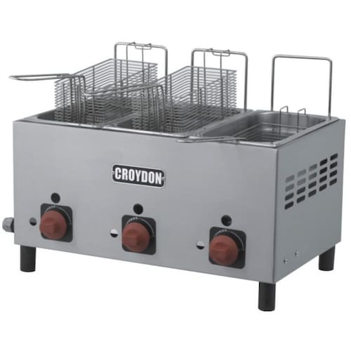 Fritadeira a Gás 9 Litros 3 Cestas F3AG Croydon. Ideal para cozinhas industriais, restaurantes, lanchonetes e similares. Estrutura em aço inox e cubas independentes que permitem fritar diferentes alimentos simultaneamente, com eficiência e praticidade. CUBAS: 3-GN 1/3. CAPACIDADE: 3x3l. POTÊNCIA(GLP): 16.785BTU/h. PRESSÃO DE TRABALHO(GLP): 280mm.c.a. CONSUMO(GLP): 360g/h. PESO BRUTO: 8,6kg. DIMENSÕES(CxAxL): 39x41x59cm. Fritadeira a Gás 9 Litros 3 Cestas F3AG Croydon é na Atau.