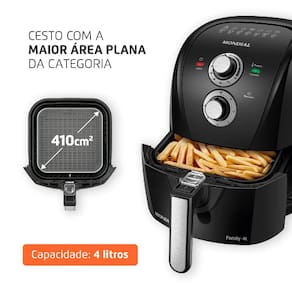 CAPACIDADE DE 4 LITROS + CESTO QUADRADO: Considerado o cesto com a maior área plana da categoria*, ele acomoda melhor os alimentos, permitindo assar e fritar por igual.