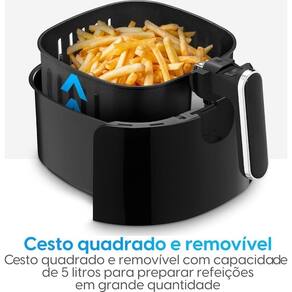 Descubra uma forma rápida e saborosa de preparar suas refeições com a Air fryer Space 5. Com uma capacidade de 5 litros, essa fritadeira é ideal para atender toda a família e permite preparar refeições em grande quantidade de forma rápida e prática. Com uma potência de 1.700W, você pode acelerar o tempo de preparo e desfrutar de refeições deliciosas em pouco tempo. O cesto removível facilita a limpeza, poupando seu tempo e permitindo que você se dedique ao que realmente importa. Além disso, o cesto pode ser lavado diretamente na lava-louças para maior comodidade. Experimente a tecnologia Black Resist, que oferece uma proteção antiaderente superior e facilita a limpeza e a manutenção no dia a dia. A tecnologia Air Circuit 360C proporciona uma circulação de ar quente em espiral, resultando em alimentos assados de forma uniforme, sem a necessidade de fritar. Isso torna suas refeições mais saudáveis, rápidas e econômicas em termos de energia. Com o diferencial do cesto quadrado, você pode preparar porções maiores sem ocupar excessivamente sua bancada. Desfrute de uma culinária mais saudável, reduzindo a gordura em 80% nas suas receitas favoritas. O timer de 60 minutos, com aviso sonoro, permite que você selecione o tempo de preparo com facilidade. A temperatura ajustável de 80 a 200C permite que você cozinhe diferentes tipos de alimentos conforme desejado. Além disso, a Space 5 oferece proteção avançada contra superaquecimento, proporcionando tranquilidade e segurança durante o cozimento dos alimentos. Descubra uma forma prática e eficiente de preparar suas refeições com a Air fryer Space 5.