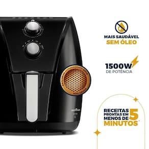 A Air Fryer conta com a tecnologia Air Flow 360°, que promove a circulação de ar ideal para cozinhar seus alimentos de forma rápida e uniforme. Ela possui base antiderrapante, garantindo segurança durante o uso, e atinge temperatura máxima de 200°C. Um indicador LED sinaliza o funcionamento do aparelho.