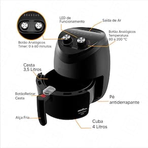 Ela contém capacidade para 4 litros na cuba e 3,5 litros no cesto removível, que tem revestimento antiaderente Dura Mais, que facilita a limpeza e evita que os alimentos grudem. O cesto também tem alça resistente a altas temperaturas e trava de segurança, que impede que ele se solte durante o uso.