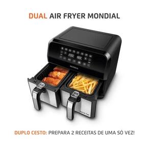 Desfrute de refeições saudáveis e saborosas com a Fritadeira Air Fryer Dual Duplo Mondial! Com potência de 2000W e tecnologia Dualzone, prepare duas receitas simultaneamente, com tempos e temperaturas diferentes. Os 2 cestos removíveis oferecem capacidade total de 8 litros. Acompanha 01 Livro de Receitas e 01 Manual de Instruções. Fabricada em PP e Inox, esta fritadeira une praticidade e modernidade à sua cozinha. Torne suas refeições mais saudáveis e deliciosas com a Air Fryer Dual Duplo Mondial!