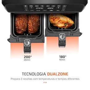 TECNOLOGIA DUALZONE: A tecnologia possibilita preparar 2 pratos simultaneamente, cada um em um cesto e com temperaturas e tempos distintos.