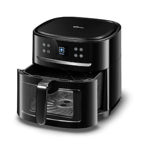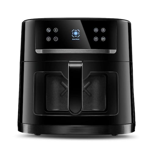 Fritadeira Air Fryer com 8 litros de capacidade, sistema Smart que identifica até 12 alimentos e se ajusta automaticamente, visor transparente com lâmpada, controle automático de temperatura de 50 a 200°C, timer com auto desligamento de até 60 minutos, função pausar, ultra silenciosa, 12 funções de preparo pré-programadas, acionamento Touch Screen, revestimento interno antiaderente.Porta-fio