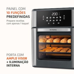 Capacidade: 12 litros Potência: 2.000W (127V) e 2.200W (220V) Painel digital touch com 10 funções pré-programadas Temperatura ajustável até 200°C Timer de até 90 minutos com desligamento automático Visor amplo com iluminação interna Termostato inteligente Acompanha 2 assadeiras antiaderentes (1 perfurada e 1 fechada) Acompanha luva de silicone Funções: assa, frita, cozinha, reaquece sem óleoPorta-fio