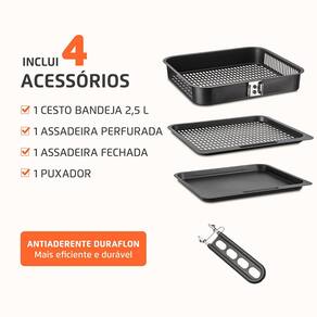 Acessórios: Cesto bandeja com 2,5L, puxador, assadeira perfurada e assadeira fechada.