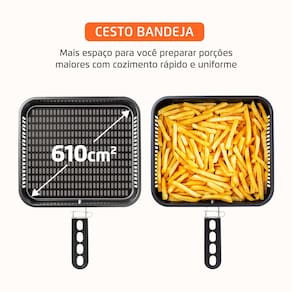 Cesto Bandeja + 2 Assadeiras Antiaderentes: Mais capacidade para preparar, de forma mais rápida e uniforme, diferentes tipos de alimentos, com praticidade no manuseio e facilidade na limpeza graças ao revestimento antiaderente.