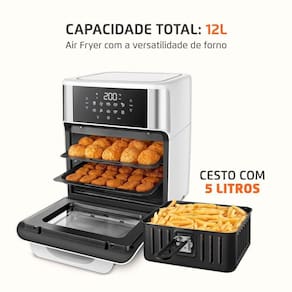 Grande Capacidade de 12 Litros: Prepare grandes porções e até 3 receitas de uma só vez. Com um cesto de 5 litros e duas assadeiras, a Air Fryer Forno é perfeita para toda a família.