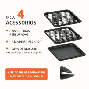 Acessórios Completos: Acompanha 2 assadeiras, 1 cesto de 5L, 1 bandeja coletora de resíduos e uma luva de silicone para manusear os acessórios com segurança.