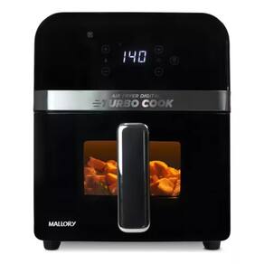 Fritadeira Air Fryer Mallory Turbocook com visor em vidro, capacidade de 6 litros, controle de temperatura ajustável, timer e potência de 1500W.Porta-fio