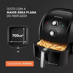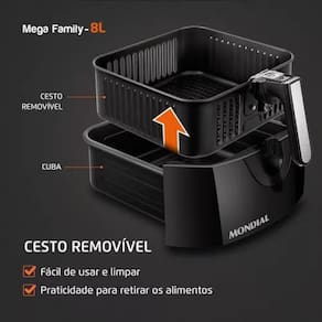Fritadeira Air Fryer Mondial 8L 1900W Preto AFN-80-FB - 110V, com capacidade para até 8 litros, ela permite preparar grandes porções como 25 pães de queijo, 10 postas de salmão ou até um frango inteiro, oferecendo praticidade e rendimento para toda a família. Seu cesto removível garante mais facilidade na hora de servir e limpar, enquanto o design moderno Full Black traz um toque de elegância ao ambiente. O antiaderente Duraflon, tecnologia exclusiva da Mondial, impede que os alimentos grudem no fundo do cesto e promove um cozimento mais uniforme, otimizando o espaço interno.Porta-fio