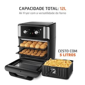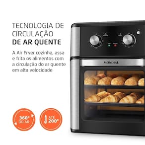 Painel Digital Com 10 Funções Predefinidas: batata, frango, carne, peixe, camarão, pão de queijo, pizza, bolo, legumes e a função reaquecer. Porta Com Amplo Visor + Iluminação Interna. Antiaderente Duraflon. Acompanha Luva de Silicone. Aviso sonoro e desligamento automático. Luz indicadora.Porta-fio