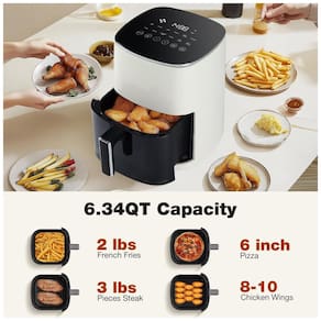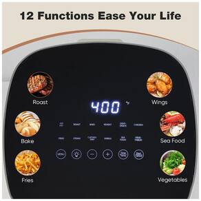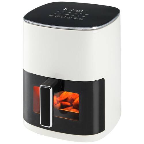 Fritadeira Air Fryer OLIXIS 5,6L com 12 funções: fritar, assar, grelhar, desidratar, cozinhar a vapor. Possui janela de visualização, controle de temperatura e cesta antiaderente.Porta-fio