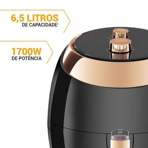 Frita com pouquíssimo ou nenhum óleo; Luzes de aquecimento e funcionamento; Cesto removível, pode ser lavado em lava louças; Com coletor de resíduos; Não faz fumaça; Controle de temperatura ajustável de 80°C até 200°C; Base antiderrapante; Capacidade do cesto de 5,5L; capacidade total da cuba de 6,5L; Timer de 30 minutos; Seletor de temperatura; Composição: Metal e Plástico; Potência: 1700WPorta-fio
