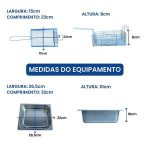 01 Base em aço inox com 4 pés de apoio 01 Cabeçote com resistência blindada 01 Cesto de fritura aramado 01 Cuba gastronômica 01 Manual de instruções