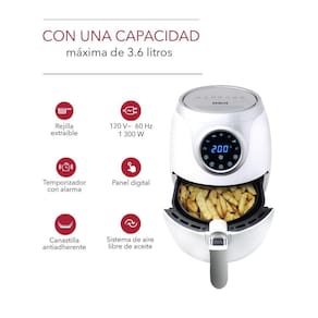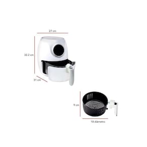 SAUDÁVEL: Não há necessidade de usar óleo de cozinha; uma vez que funciona com um sistema de ar. Inclui um botão de cozimento predefinido e as seguintes funções: Batatas, Bacon, Camarão, Bolos, Frango, Bife e Peixe. TEMPERATURA: No ecrã selecione entre 80 °C a 200 °C e um tempo máximo de 30 minutos. Quando o tempo de cozimento terminar, um alarme soará. RECEITAS: Ao comprar seu produto, obtenha uma receita com 100 pratos ou sobremesas diferentes. Digitalize o código QR e prepare milanesas, hambúrgueres, espetos e muito mais. DISPLAY: Inclui um indicador de aquecimento e energia. Enquanto o equipamento está ligado, ele exibe alternadamente o temporizador e a temperatura; Além disso, os símbolos padrão acendem para mostrar a função definida. ACESSÓRIOS: A cesta e a grade são feitas de material antiaderente; Isso é caracterizado por ser durável e resistente. Sua capacidade máxima é de 3,6 litros.
