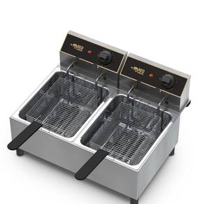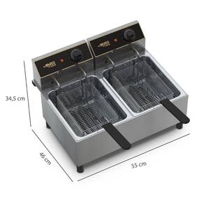 Este fritador de mesa tem capacidade para 9L de óleo e 6000w de potência. Um fritador profissional que permite fritar mais de um tipo de porção por vez. Equipamento super fácil de limpar e trocar o oléo, pois os painéis de controle são móveis e os reservatórios de óleo removíveis. O controle de temperatura é feito por termostatos individuais que permitem fritar duas porções por vez com temperaturas diferentes e até mesmo em momentos de baixo movimento usar apenas um dos tanques/reservatórios. Os cestos de fritura possuem alças/cabos em material plástico para facilitar a retirada com segurança.