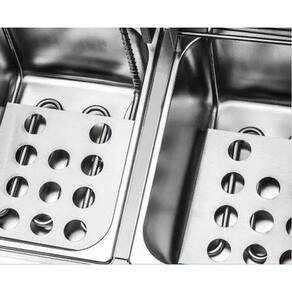 Fritadeira comercial de alta potência que proporciona rápida recuperação de temperatura, essencial para frituras com qualidade. Termostato regulável, cesto niquelado em aramado de alta resistência, o níquel permite um brilho e resistência a mais no cesto, aquecimento por resistência elétrica blindada em aço inox, lâmpada indicadora de aquecimento, reservatório removível, acabamento em aço inox escovado, pés antiderrapantes. Altamente resistente e durável, ideal para uso diário residencial ou profissional como lanchonetes, hamburguerias e restaurantes. Um utensílio que confere beleza e durabilidade em sua cozinha, muito leve e fácil de manusear, além de seu design moderno e inovador. Pode ser doméstica ou industrial, de acordo com sua demanda. Não acompanha tampa.
