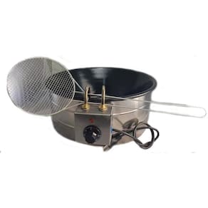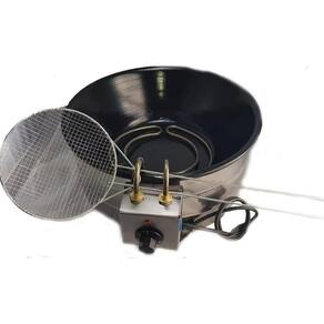 Fritadeira grande com arco em aço inox. Capacidade para 7 litros de óleo. Acompanha Escumadeira de arame industrial estanhado para fritura de 20cm de diâmetro Termostato de 0 a 300º com regulagem e com seletor alfanumérico. Resistência elétrica em tubo inoxidável. Consumo médio. 3kwh no 220v e 2,5kwh no 127v Tacho esmaltado Preto Lâmpada piloto para indicar quando esta ligada a resistência. Própria para pastel, salgados e outros tipos de frituras. Linha industrial e residencial. Medidas: Altura 19cm, profundidade 16cm, diâmetro 44cm. Potência: em 127v - 2500W e em 220v - 3000W Minimo de óleo: 4 litros Ela possui garantia de 90 dias