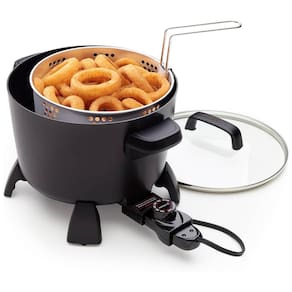 Fritadeira elétrica a óleo Presto com capacidade de 7,5L, superfície antiaderente, controle de temperatura e 1500W de potência. Ideal para cozinhar a vapor, ensopar, assar, ferver e fritar.Porta-fio