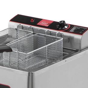 O Fritador Elétrico Zona Fria de Água é fabricado externamente em aço inox aisi 430 escovado e tanque em aço inox aisi 304. Esse Fritador acompanha 2 cestos pequenos e 1 cesto grande, fabricados em tela aramada e termostato para controle de temperatura e segurança.