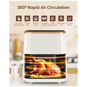 Cozimento Frito Saudável: Nossa fritadeira de 5,3 litros com tecnologia de circulação de ar rápido a 360° permite que você obtenha texturas crocantes em cada centímetro do alimento, com até 85% menos gordura em comparação à fritura tradicional. A capacidade de cozimento para famílias pode servir de 3 a 5 pessoas de uma vez, garantindo que você prepare refeições para toda a família e até mesmo entretenha convidados com facilidade.