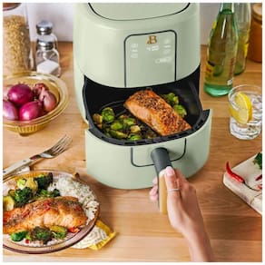 Fritadeira elétrica sem óleo com tecnologia TurboCrisp, painel digital touchscreen, 4 programas pré-configurados (Air Fry, Bake, Roast e Reheat), controle de temperatura e tempo, estrutura compacta em plástico e metal, cesto interno com revestimento antiaderente livre de PFOA e PFOS. Cesto e bandeja removíveis e compatíveis com lava-louças.Porta-fio