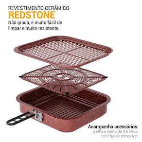 O cesto quadrado espaçoso com alça removível oferece praticidade e segurança ao retirar os alimentos, enquanto o revestimento Redstone garante maior resistência e durabilidade.