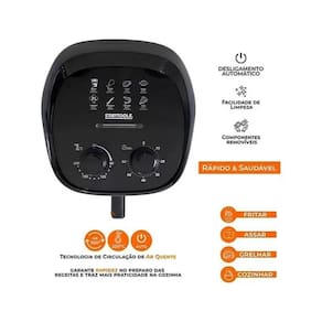 Fritadeira Elétrica Air Fryer com cesto de 3,4 litros, controle de temperatura ajustável até 200°C, timer de até 30 minutos, desligamento automático, cesto removível antiaderente e gaveta com trava de segurança.Porta-fio
