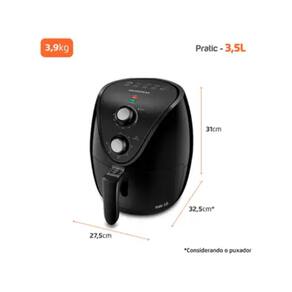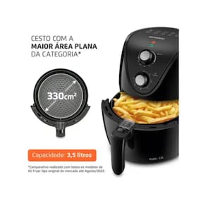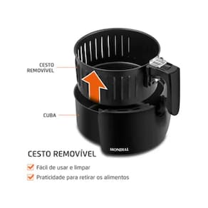 os alimentos sem precisar adicionar óleo ou manteiga. Além disso, a alta potência proporciona rapidez no preparo das receitas. A Air Fryer tem capacidade de 3,5 litros e o cesto é revestido com antiaderente Duraflon, tecnologia exclusiva Mondial.