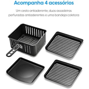 Fritadeira elétrica e forno 4 em 1: assa, frita sem óleo, desidrata e reaquece. Tecnologia Air Circuit para circulação homogênea de ar quente. Painel touch com seletor de temperatura digital. Design moderno com acabamento em inox. Porta removível e bandejas que podem ir na lava-louças. Proteção contra superaquecimento. Base antiderrapante e alça fria.Porta-fio