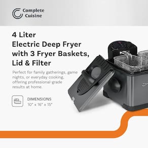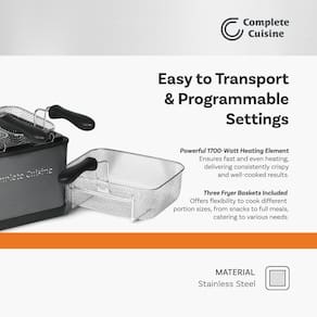 Eleve sua experiência de fritura com a fritadeira elétrica Complete Cuisine de 4 litros, projetada para trazer conveniência e estilo à sua cozinha. Seja fritando asas de frango crocantes, batatas fritas douradas ou peixes salgados, esta fritadeira oferece resultados excepcionais com seu poderoso elemento de aquecimento de 1700 watts e controle preciso da temperatura. A grande capacidade de 4 litros garante que você possa preparar refeições para toda a família, enquanto a tampa durável de aço inoxidável com janela de visualização e filtro embutido ajuda a monitorar sua culinária sem bagunça. Esta fritadeira possui uma panela esmaltada removível que torna a limpeza rápida e descomplicada, para que você possa passar mais tempo saboreando sua comida e menos tempo esfregando. Com 3 cestos de fritadeira incluídos, oferecem versatilidade, esteja você preparando pequenos lanches ou uma refeição saudável. O design compacto, os pés antiderrapantes e o elegante acabamento em aço inoxidável tornam esta fritadeira uma adição elegante e funcional a qualquer cozinha. Desfrute de uma fritura segura e eficiente com proteção contra superaquecimento integrada e um botão de controle fácil de usar para ajustar a temperatura às suas necessidades. Seja cozinhando para reuniões familiares, organizando noites de jogos ou simplesmente saboreando suas guloseimas fritas favoritas, a Fritadeira Complete Cuisine oferece sempre resultados consistentes e deliciosos. Transforme sua cozinha em um paraíso para frituras e experimente a facilidade de cozinhar de nível com este aparelho essencial.