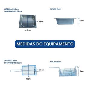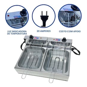 CARACTERÍSTICAS GERAIS: Capacidade Total da Cuba: 5 Litros cada (sendo óleo + alimento) Capacidade de Óleo: de 2 a 3L Litros cada Capacidade Total 2 Cubas: 10L (sendo óleo + alimento) Termostato de 50°C a 300°C (com regulagem) Voltagens 110 e 220 (não é Bivolt)
