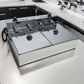Fritadeira elétrica industrial com 2 cubas independentes de 5 litros cada, totalizando 10 litros. Fabricada em inox de alta qualidade. Termostato ajustável de 50°C a 300°C. Ideal para uso comercial e residencial com alta demanda.Porta-fio