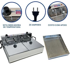 Fritadeira elétrica industrial com 2 cubas de 5 litros cada, escorredor tamanho médio, 2 tampas inclusas. Cuba com capacidade total de 10 Litros (óleo + alimentos). Capacidade de óleo: 2,5 litros cada cuba. Termostato ajustável de 50°C a 300°C. Fabricada em inox de alta qualidade. Uso comercial e residencial.Porta-fio