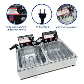 CARACTERÍSTICAS GERAIS: Capacidade Total da Cuba: 5 Litros cada (sendo óleo + alimento) Capacidade de Óleo: de 2 a 3L Litros cada Capacidade Total 2 Cubas: 10L (sendo óleo + alimento) Termostato de 50°C a 300°C (com regulagem) Voltagens 110 e 220 (não é Bivolt)
