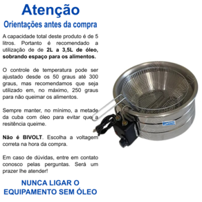 Fritadeira Elétrica redonda com Aro em inox e Tacho em alumínio, Cesto Em Arame Industrial Estanhado, Resistência elétrica Inox de 1600w Com Termostato que Regula de 50 a 300 graus.