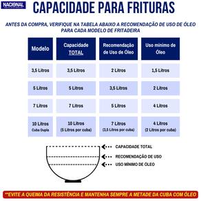 - Capacidade de óleo: de 2,5L até 4L (sobrando espaço para os alimentos e resistência)