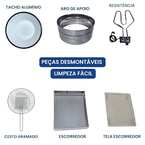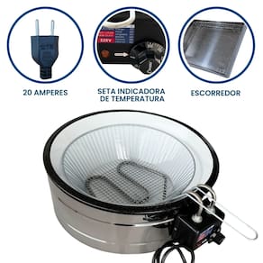 Tacho esmaltado com capacidade de 10 litros, ideal para uso comercial e residencial. Inclui escorredor grande para frituras sequinhas, termostato ajustável de 50°C a 300°C, cabos reforçados em inox e resistência blindada.Porta-fio