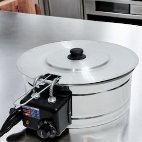 Estrutura em aço inox de alta durabilidade, tampa inclusa, termostato ajustável de 50°C a 300°C.Porta-fio