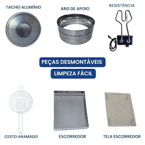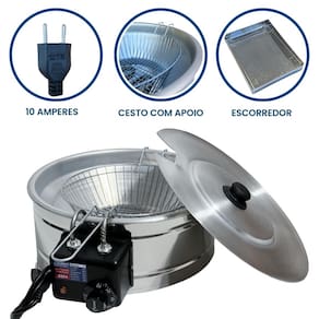 Tacho Redondo 5 Litros com Escorredor Médio e Tampa. Termostato regulável de 50°C a 300°C. Cabos reforçados em Inox. Uso comercial e residencial.Porta-fio