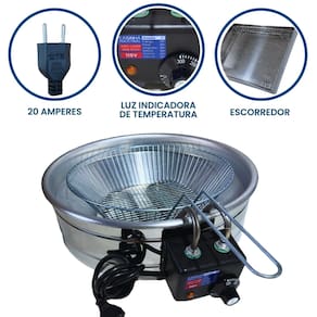Tacho redondo com escorredor médio, ideal para restaurantes, lanchonetes, quiosques e cozinhas residenciais. Termostato regulável e alça para escorrer óleo. Cabos reforçados em inox.Porta-fio