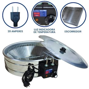 Tacho Redondo 7 Litros + Escorredor G + Tampa. Termostato regulável de qualidade. Alça para escorrer o óleo. Cabos reforçados em INOX. Uso Comercial e Residencial.Porta-fio
