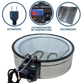 Tacho esmaltado 7 litros com escorredor médio. Termostato regulável de 50°C a 300°C. Cabos reforçados em inox. Uso comercial e residencial.Porta-fio